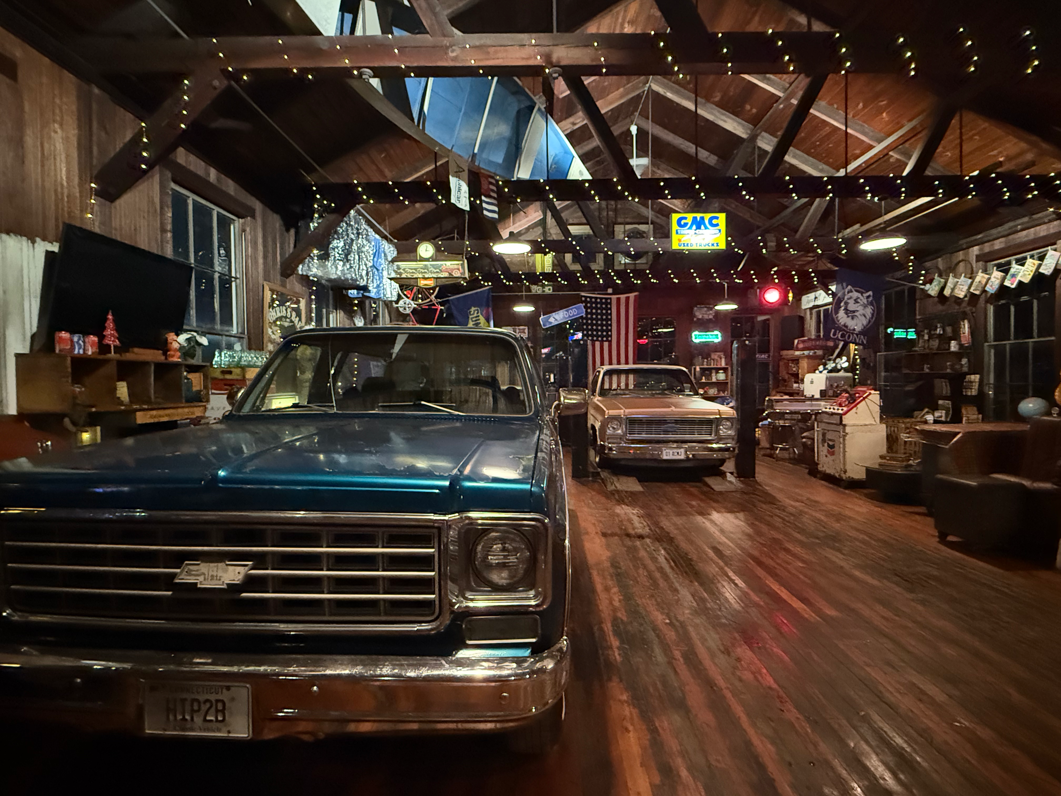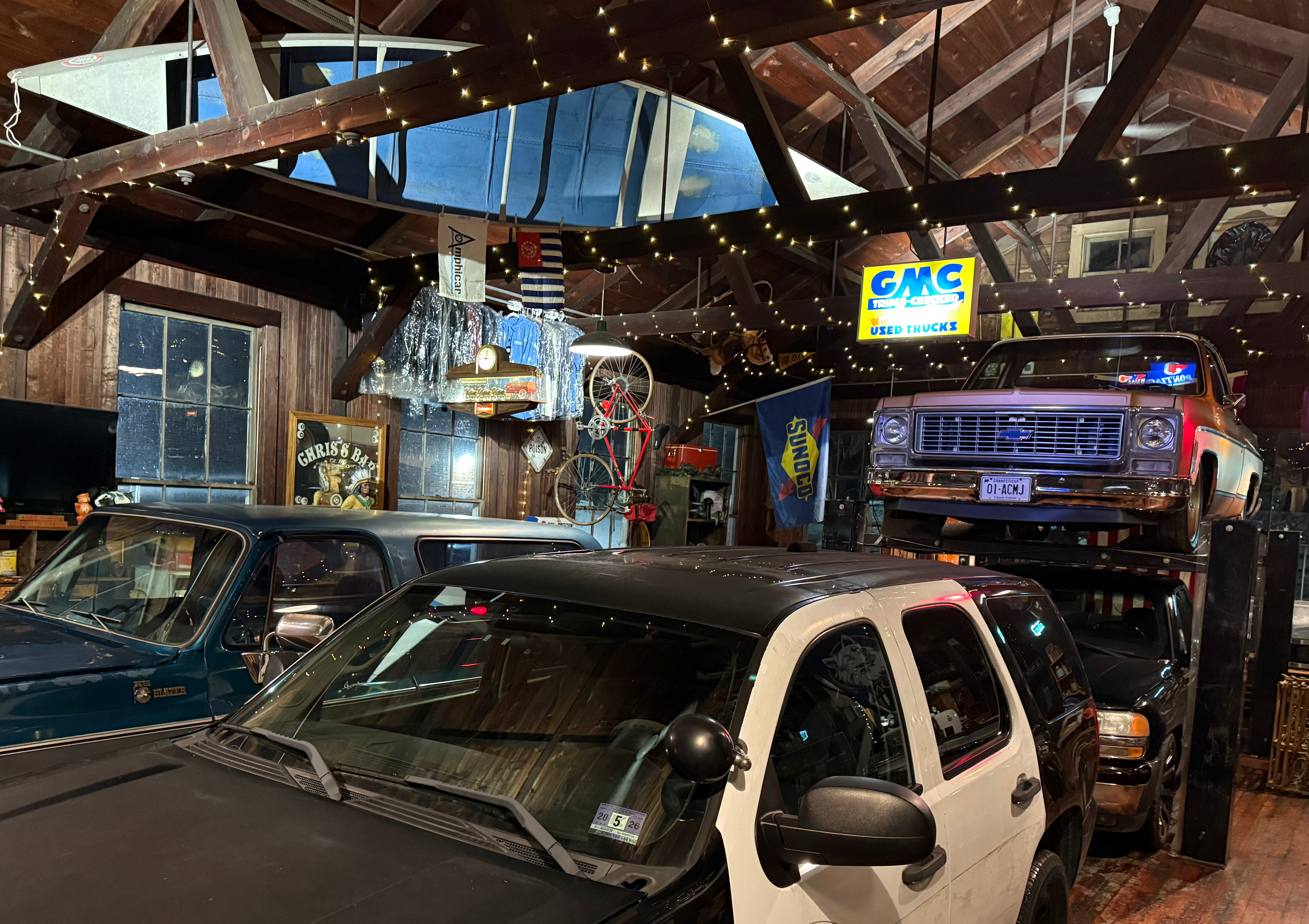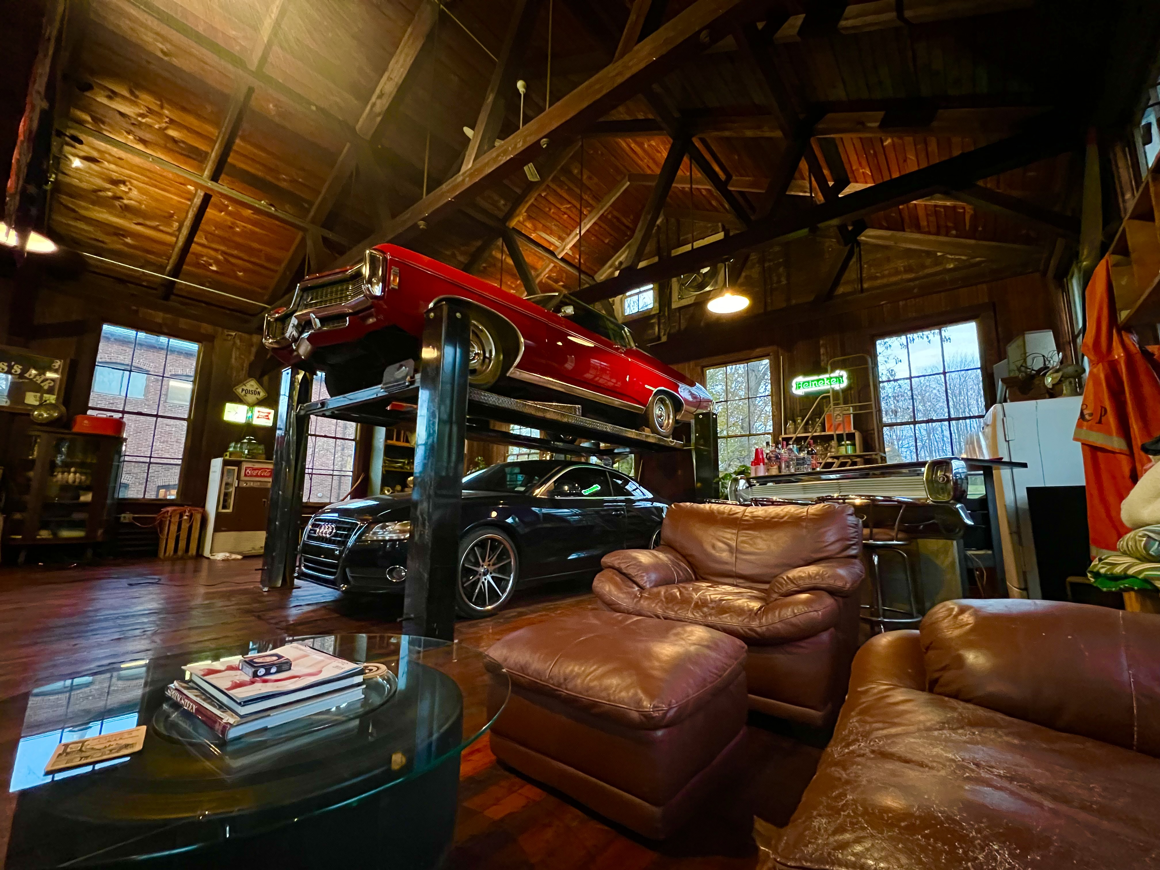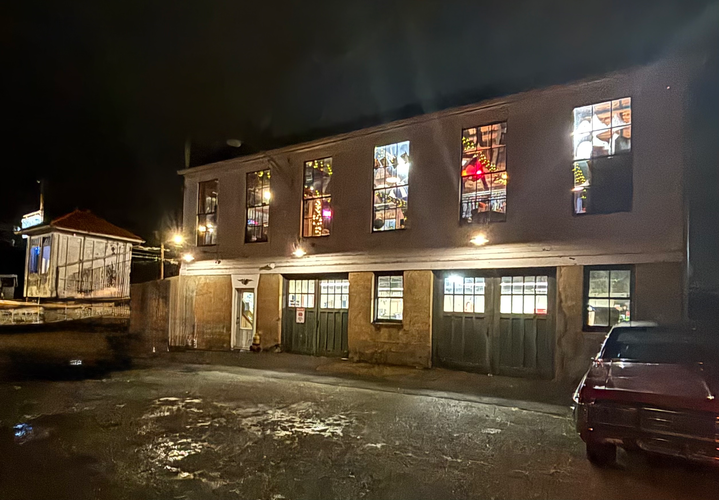 Thanks to some very generous, and widely talented friends, the necessary repairs began. Cleaning the walls, restoring the hardwood floors, and replacing pane after pane of broken 100-year-old glass. Then came storing classic cars inside like honored guests instead of forgotten relics, and cruise nights, happy hours, live music, and ‘The Wedding’, complete with hotrods and vintage campers, and the annual Christmas party, held the same night as the village’s torchlight parade, flooding the garage with people, music, and headlights in the cold.
